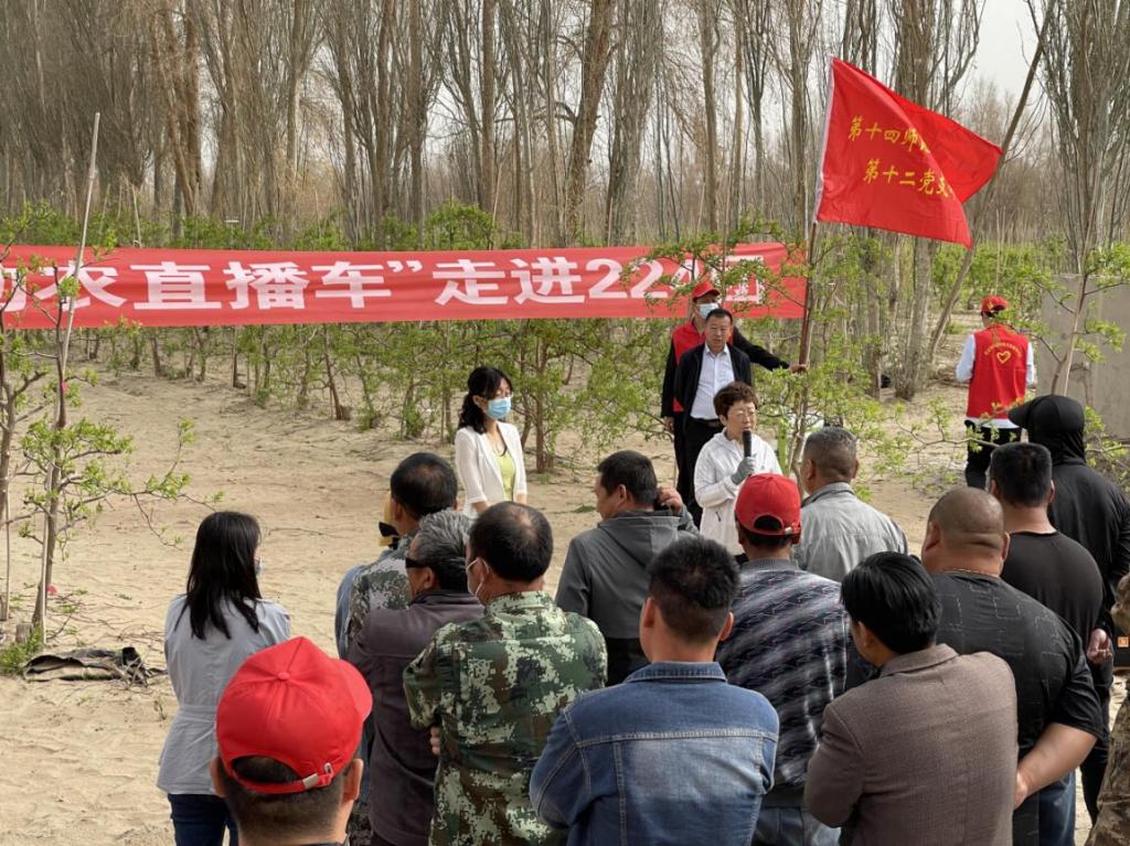 由十四师发起的“巾帼科技助农直播车”走进224团和皮山农场。在十四师224团,吴翠云教授一行来到红枣主干型结果示范园为职工进行培训,吴翠云教授就枣园管理进行了讲解。团队研究生常年驻点在红枣“科技小院”,将论文写在田间地头,经常与职工进行田间技术交流,并将发现的技术问题与团队老师进行交流。