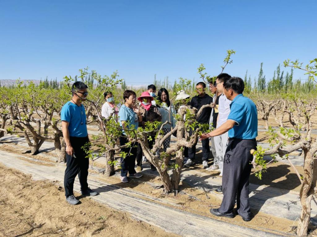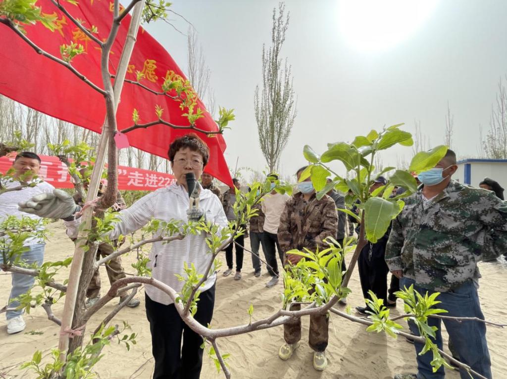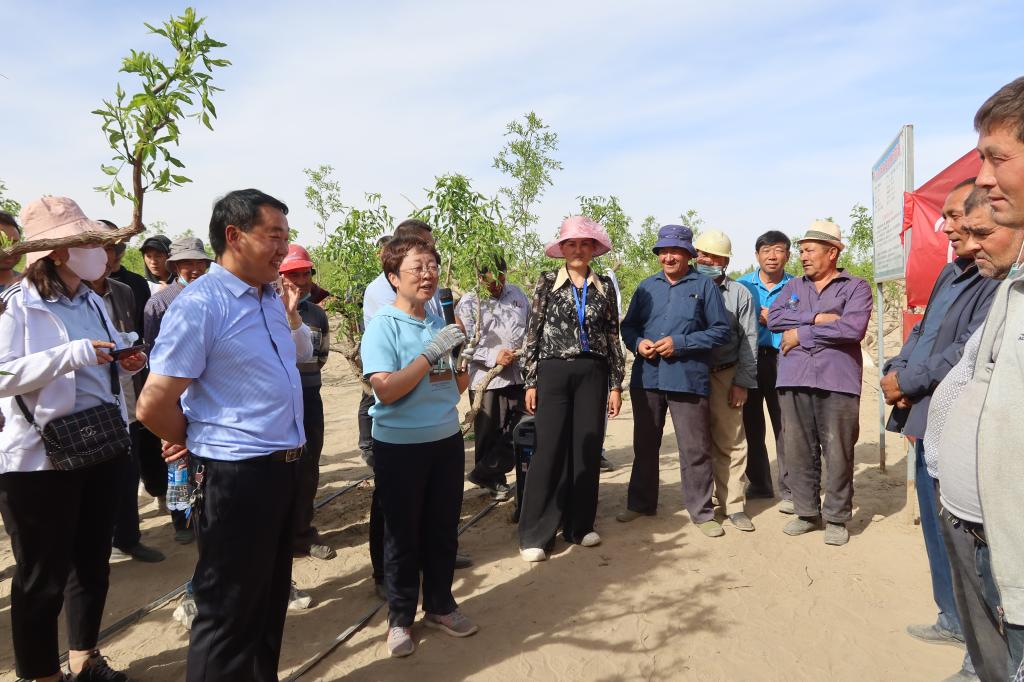 在皮山农场,吴翠云教授一行前往田间地头,从红枣抹芽、春季施肥、病虫害防治等方面进行了培训。现场参加培训的职工开展了枣树抹芽比赛,团队教师逐一进行了点评,何仕永副政委与吴翠云教授自掏腰包为现场参与修剪的职工进行了奖励。