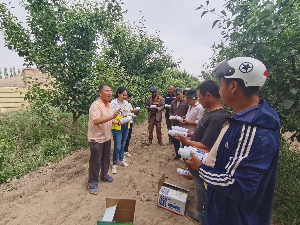 在53团3连,包建平副教授针对香梨生产存在问题,开展香梨夏季修剪、施肥和减少落果等技术培训。张琦教授指导果农辨别香梨枝枯病,提出防治技术措施,并为果农发放了防治香梨枝枯病的农药,讲解了农药使用方法。在53团4连,张琦教授针对西梅高标准建园开展了西梅整形修剪技术培训。