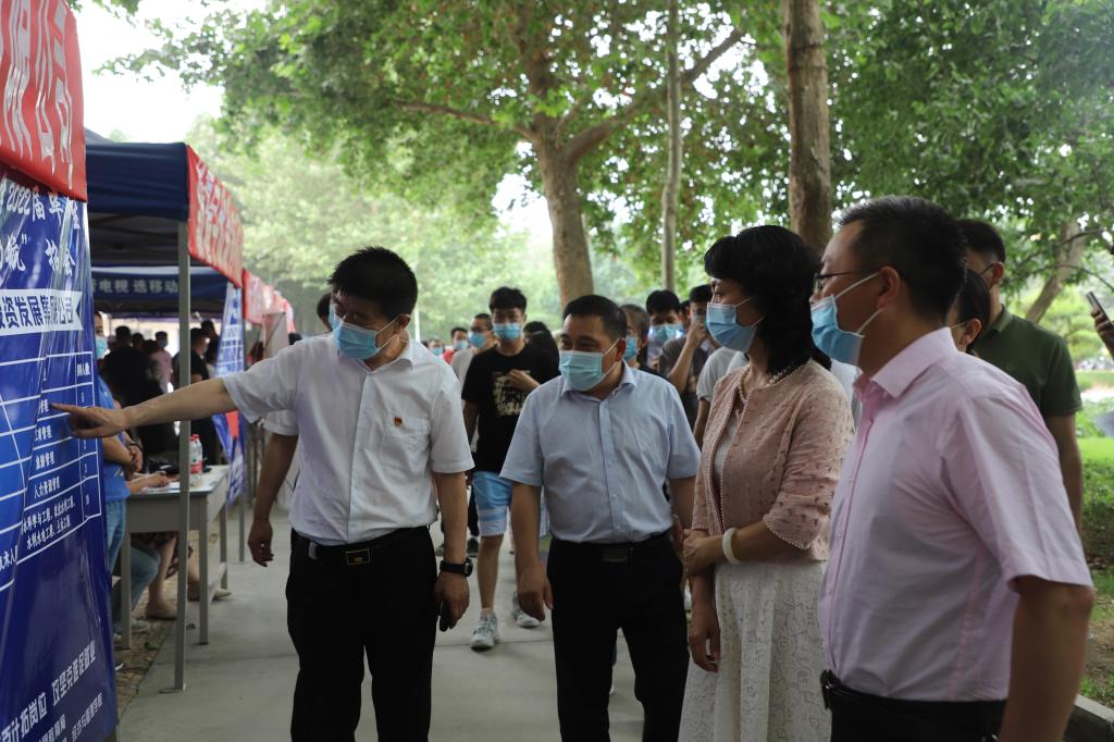 校领导来到招聘现场与企业深入交流,了解招聘需求及招聘计划,并向用人单位推荐优秀毕业生。