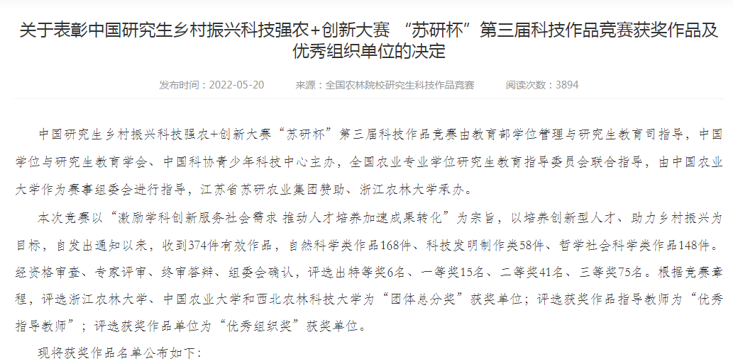 5月20日,中国研究生乡村振兴科技强农+创新大赛“苏研杯”第三届科技作品竞赛决赛采用线上+线下的方式在浙江杭州圆满落下帷幕。赛事以“激发创新活力,服务乡村振兴”为宗旨,以全面推进创新型人才培养为目的,已逐步成长为在业界和社会上有重要影响力的品牌赛事。