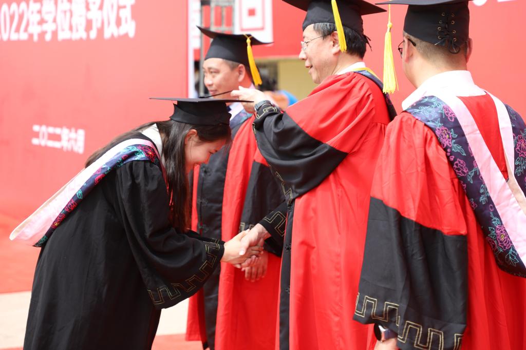赵峰华、院领导为2022届毕业生正冠,授予学位证书,并送上毕业纪念品和鲜花,祝福毕业生前程似锦,一路顺风。