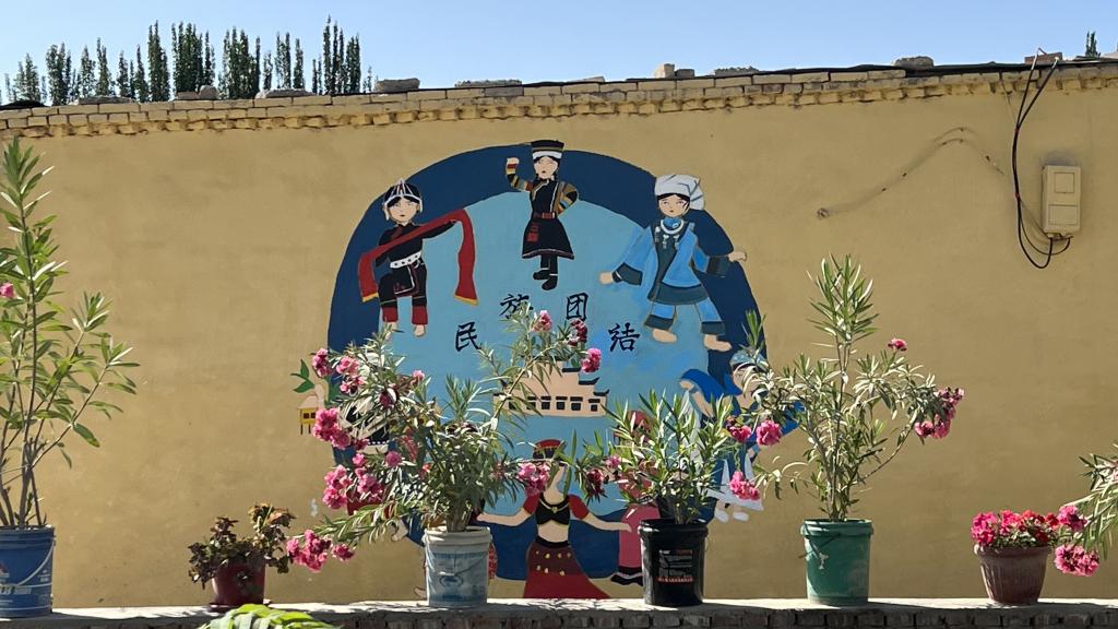 时值盛夏,烈日炎炎,队员们拿起画笔,戴上草帽,不畏酷暑,不拍困难,站在脚手架上描绘着一幅幅生动的画面,用实际行动践行着胡杨精神。绘画内容从皑皑白雪、到丰茂田野,每幅画都展现着各族人民心连心,每片景都描绘出中华儿女一家亲。