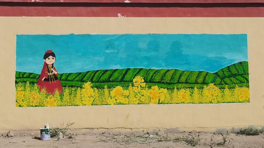 墙绘时,本地的少数民族小学生也积极加入,在创作实践中实现了“大手拉小手,团结一起走”的美好画面,也在孩子们心中根植了中华民族共同体意识。团队还向参与绘画的小学生赠送了画笔和颜料,祝愿他们快乐成长,早成栋梁。