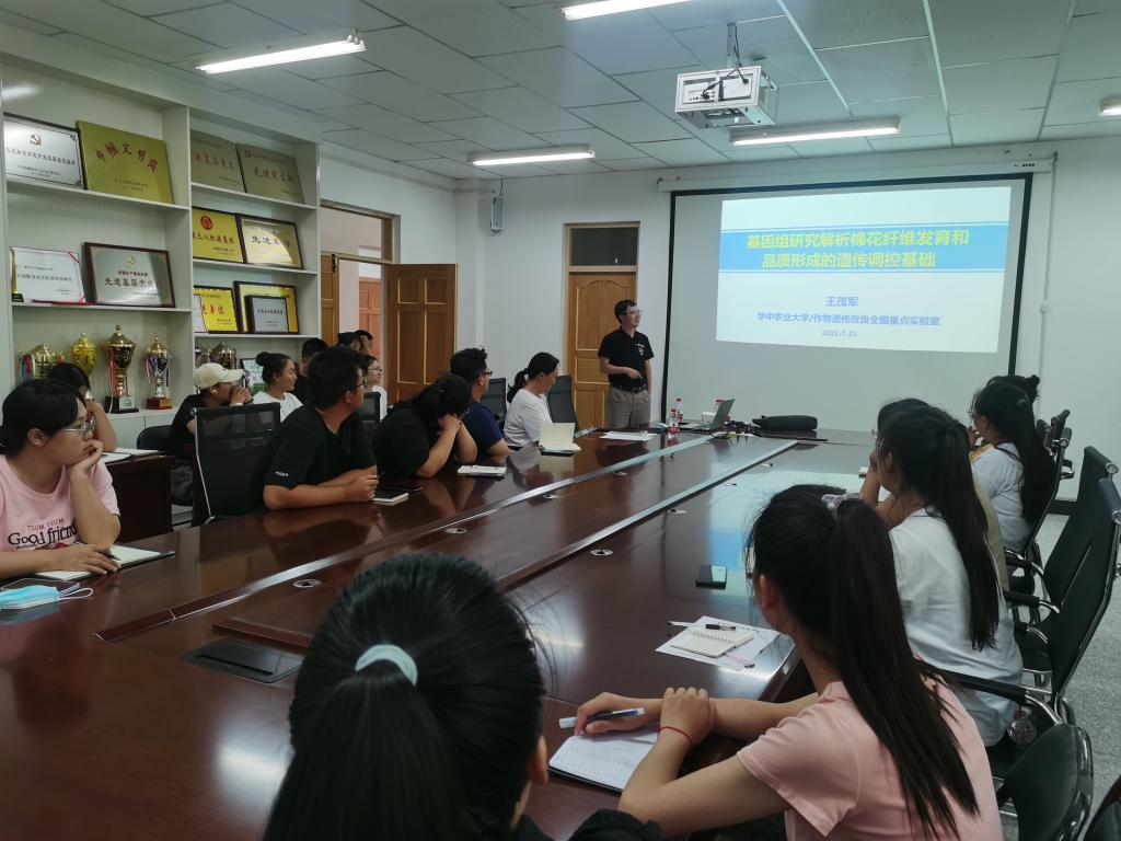 王茂军教授介绍了其团队面向优质棉花纤维严重短缺这一“卡脖子”问题,十几年来一直从事棉花纤维发育和品质形成的遗传研究。在棉花基因组进化和驯化、纤维发育和品质形成调控等方面取得了多个“首次”的创新性成果,并且为国家建立棉花的全基因组DNA变异图谱,搭建纤维品质的设计育种平台提供了技术支撑。