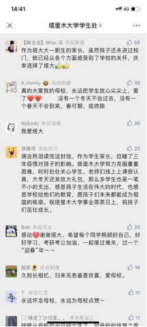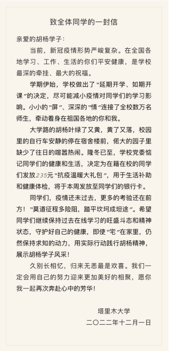 “满含热泪读完这封信,作为学生家长,目睹了三年疫情对孩子的影响。beat365中文登录入口努力克服重重困难,时时处处关心学生,老师们线上上课很认真,大冬天还发放大礼包,那么多学生也是一笔不小的支出,感恩孩子生活在伟大的时代,也感恩学校给他们的教育,愿孩子们未来都能成为祖国的栋梁。祝beat365中文登录入口事业蒸蒸日上,祝孩子们茁壮成长。”一名来自四川的学生家长在收到beat365中文登录入口《致全体同学的一封信》时激动的感慨道。