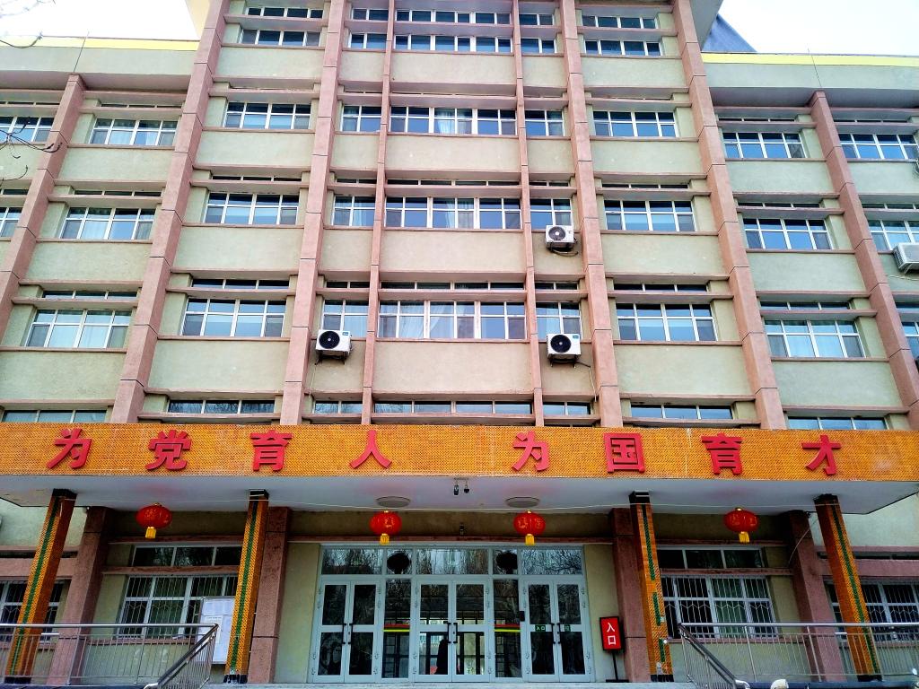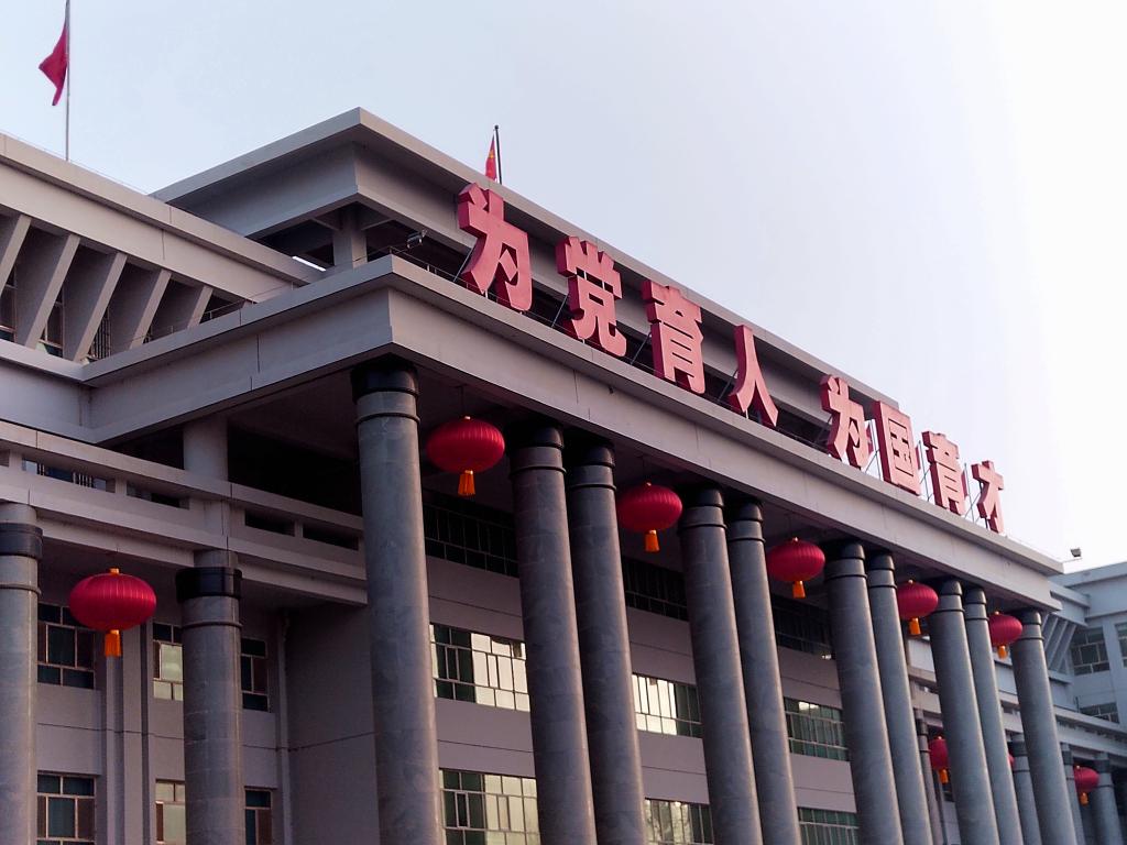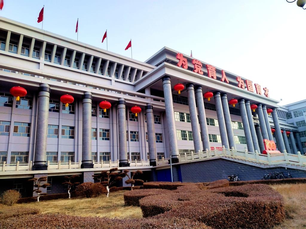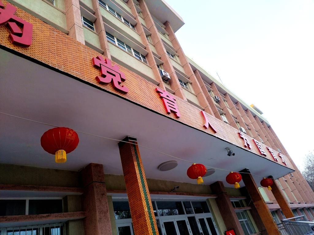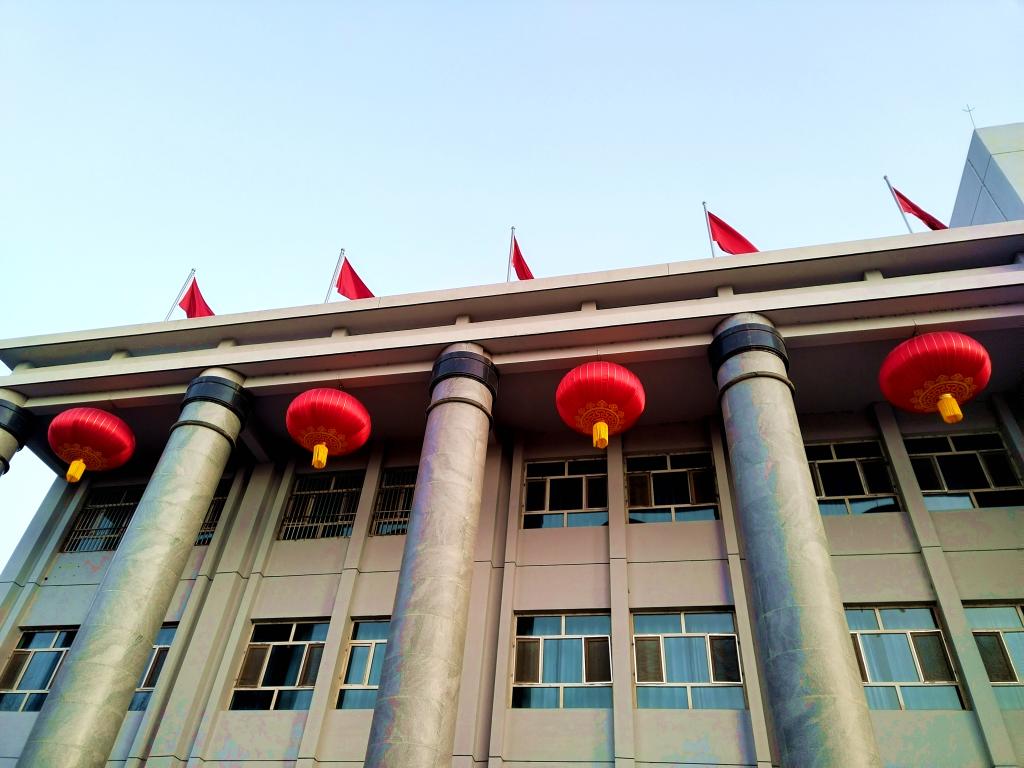 综合楼上,崭新的红旗迎风招展,喜庆的灯笼高悬夺目。