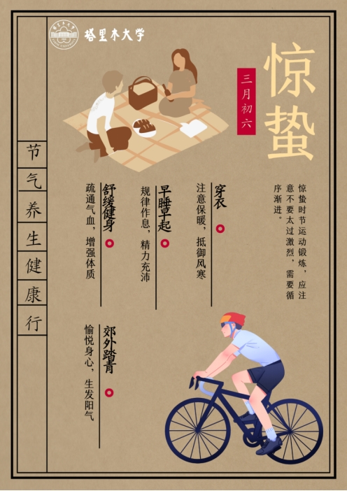 惊蛰时节温差较大,同学们要注意衣服的增减,以防被湿气寒气,侵入体内,从而患上发热感冒,引起身体的不适。同学们可选择走路、慢跑、太极拳等比较舒缓的运动方式,增强自身的抵抗力。
