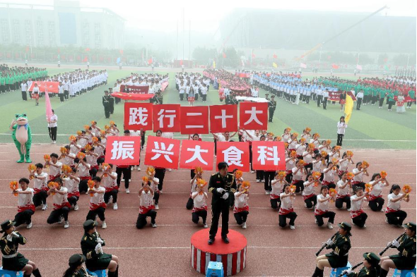 他们精神饱满,气宇轩昂,他们容光焕发,英姿飒爽。火红的院服象征似火的年华,嘹亮的口号奏响胜利的凯歌。他们手持金色麦穗,步伐铿锵有力,青春洋溢闪光。