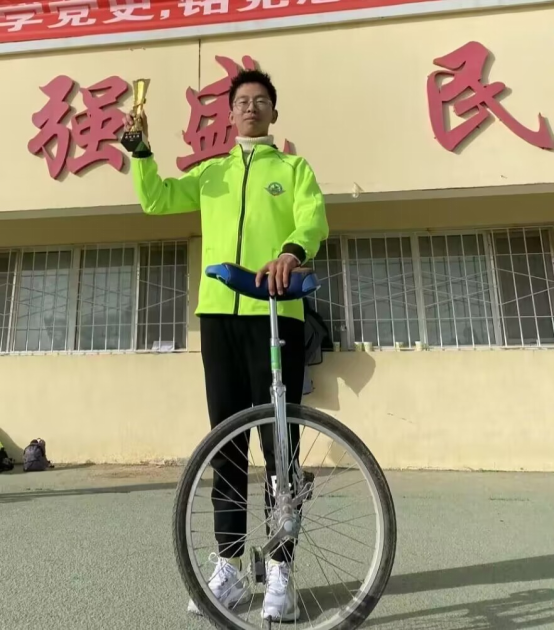 “第一次看见学长学姐的奖牌,我的眼睛流露出了羡慕的神情,夺冠的种子此刻在我的心里发了芽。”满怀着期待,他第一次踏上了独轮车,炽热的激情充斥着他的内心。