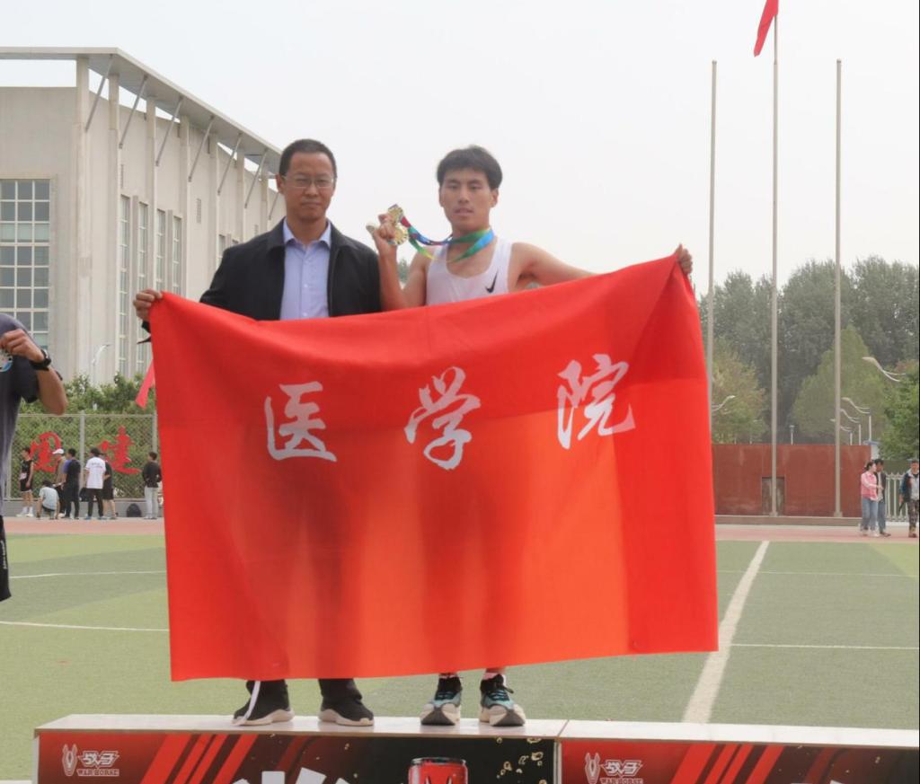 比赛现场精彩纷呈,医学院共90余名运动员参加比赛,涵盖男女各个项目。临床医学2022级13班尹文宜同学分别在男子5000米和10000米项目中夺得冠军,成为学院第一个“双冠王”,医学院党委书记孟琪为其颁奖。临床医学2021级3班的张孔孔在男子跳远项目中也取得了第二名的好成绩。
