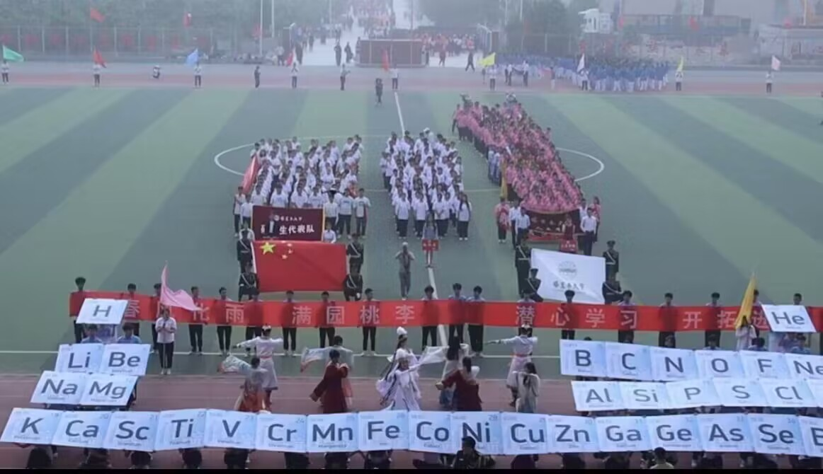 化工院学生代表队在开幕式上身着渐变蓝衣,步伐矫健,用侠骨柔情以舞会友,展青春之精神,扬化工之风采;由36名学子拼组的“元素周期表”图形跃然展现,别出心裁,用活力浇灌青春的原野,用智慧书写梦想的华章。