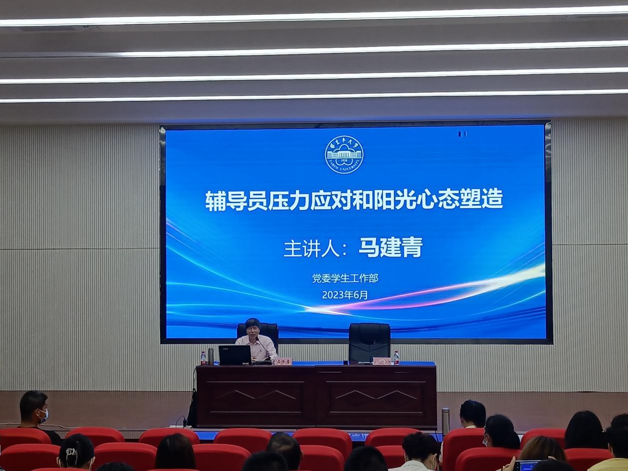 6月2日,beat365特邀浙江大学马建青教授为全体辅导员讲授心理压力应对和阳光心态塑造专题讲座,党委学工部副部长买买提江·依明主持,在新文科楼504报告厅进行。