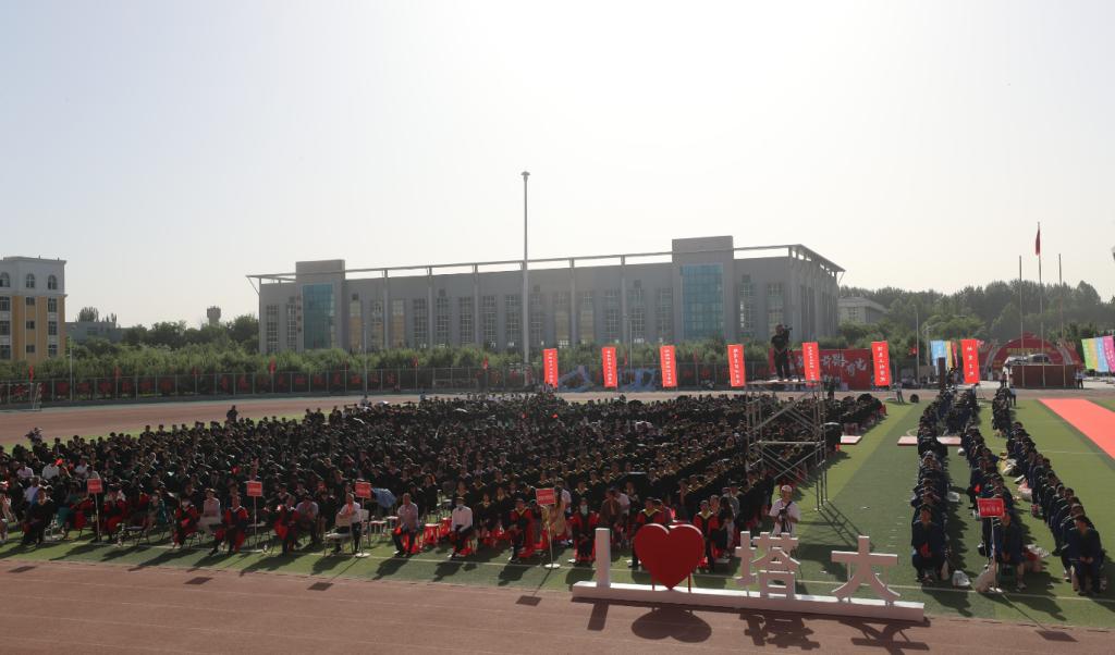 一条红地毯,在艳阳高照下,更加鲜红和耀眼,直至主席台。领导们、西部计划志愿者、优秀毕业生们,着装整齐,一边走在红地毯上,一边向毕业生打招呼。
