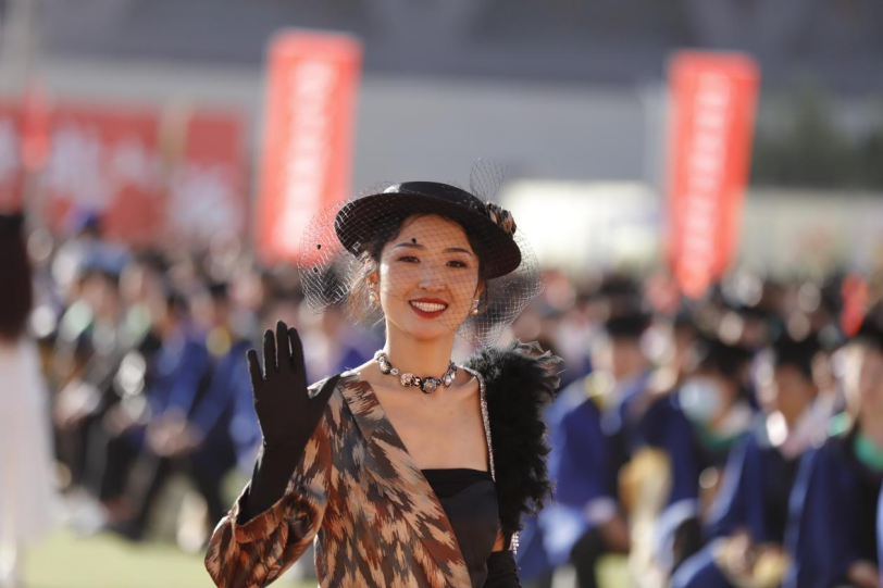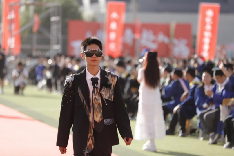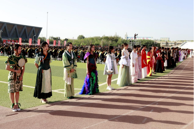 机械电气化工程学院电气工程2022级5班刘方雨函说:“我很激动可以盛装参加今年的毕业典礼,在师生面前展示这件极具民族特色的服装,展现了我们胡杨学子的风采。踏上红毯的那一刻,我觉得一切都是美好的。”