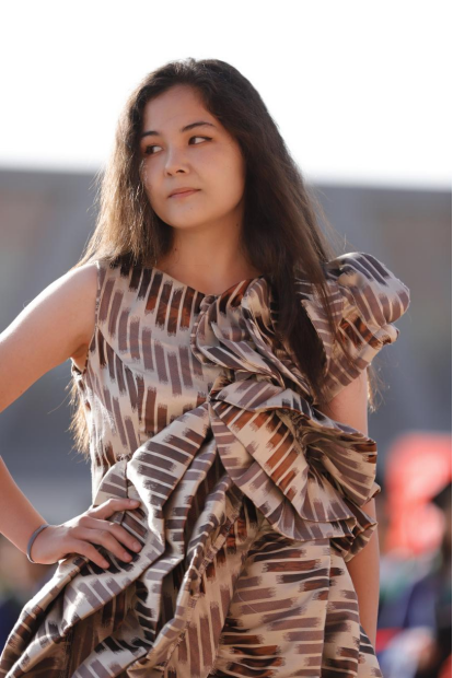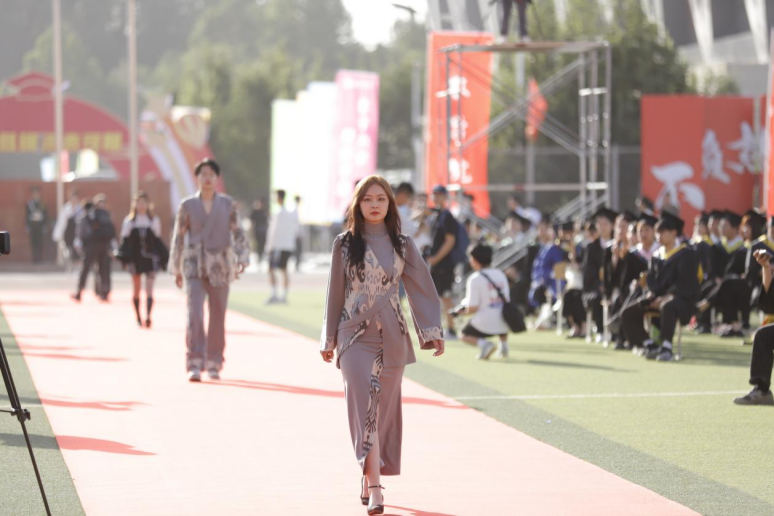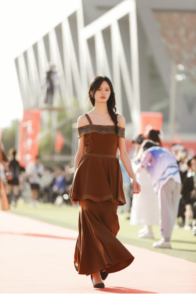 伴随着动感的歌声,“遇见”系列、“蔚然意”系列、“疆来”系列、“丝路云裳”系列、“鹤汀凫渚”系列、“尔雅”系列、“国风”系列等服饰相继亮相, 在百名学生的身上熠熠生辉。拂袖若如柳,一步一娉婷,皎若太阳升朝霞,灼若芙蕖出渌波,别开生面,引人入胜。
