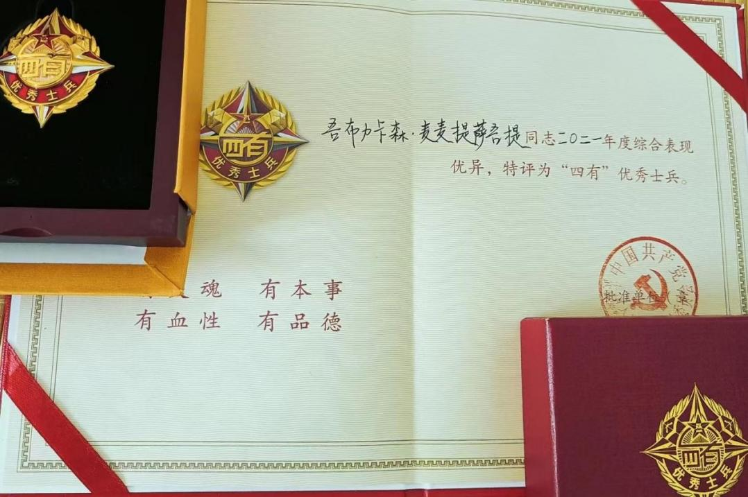 2019年8月,通过考核、体检、面试,吾布力卡森·麦麦提萨吾提顺利成为了一名新兵。在云南两年的军旅生涯,彻底改变了这个青年的稚嫩,各方面变得更加成熟,荣获嘉奖和“四有”优秀士兵。