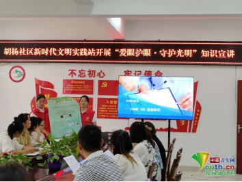图为实践队员向社区居民宣讲爱眼护眼知识的画面。中国青年网通讯员 屈越 供图