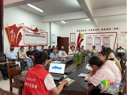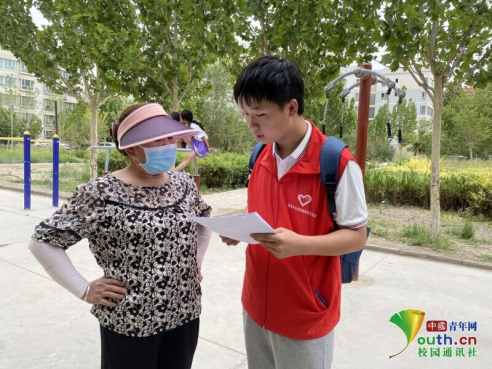 图为实践队员对社区居民进行眼部健康知识访谈的画面。中国青年网通讯员 屈越 供图