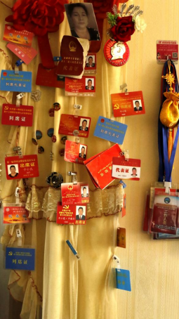 到了一师四团团部,寻访团就看到一位面容和善、穿着花裙的维吾尔族大妈,推着自行车在路边等候,这就是寻访团此次寻访对象——一师四团五连卡小花·卡德尔。寻访团师生走进家门,映入眼帘的就是卡小花参加各大会的出席证、代表证。