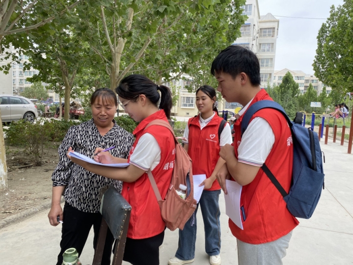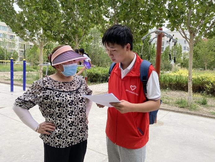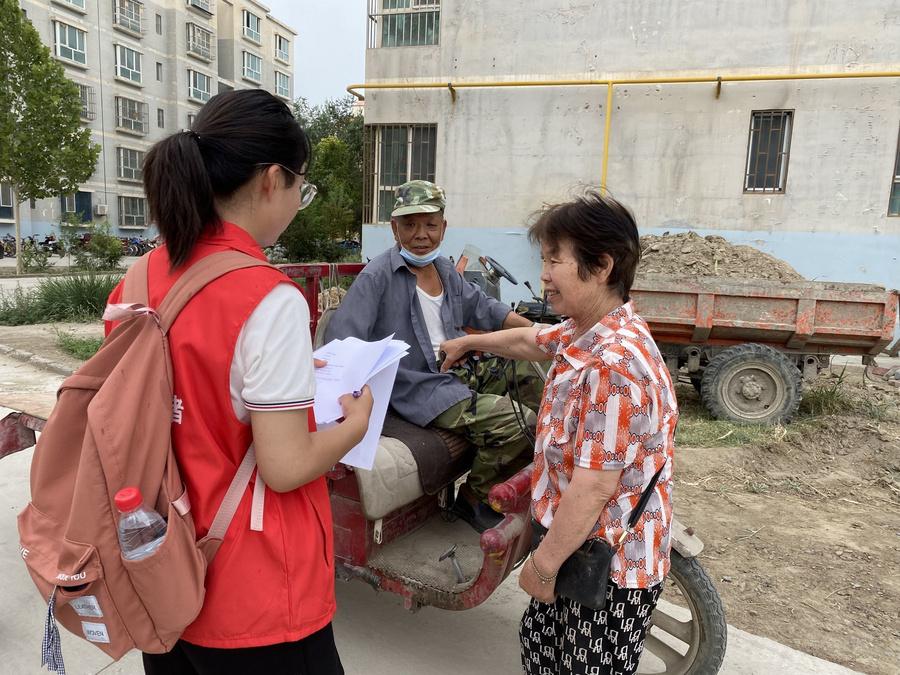 图为实践队员对社区居民进行眼部健康知识访谈的画面。
