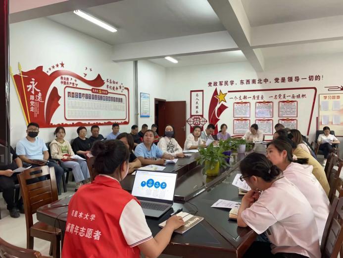 图为实践队员向社区居民宣讲爱眼护眼知识的画面。