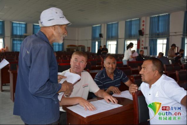 图为维吾尔族大叔对问卷进行讨论。中国青年网通讯员 屈越 供图
