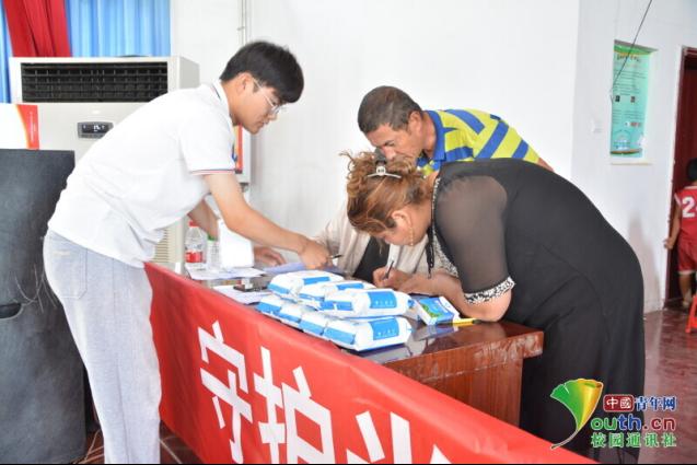 图为团队成员为村民发放免费药品。中国青年网通讯员 屈越 供图