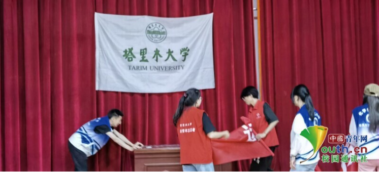 图为团队成员在连队授课前粘贴宣传标语。中国青年网通讯员程天一摄