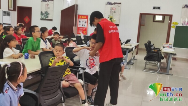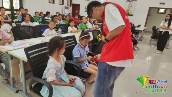 图为团队成员为青少年们分发并帮助他们佩戴红丝带。中国青年网通讯员刘思佳供图