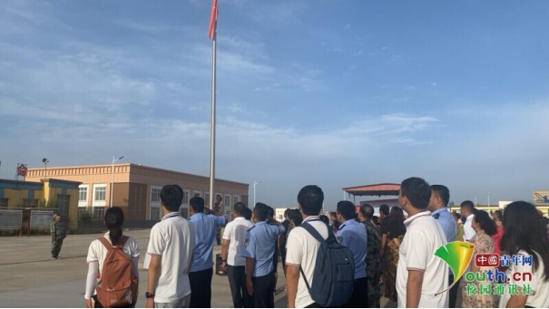 图为实践队员与党群活动中心领导、团场居民一同参加升旗仪式的画面。中国青年网通讯员屈越供图