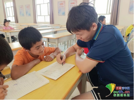 图为小队成员教小学生做数学计算题。中国青年网通讯员温菁楠摄