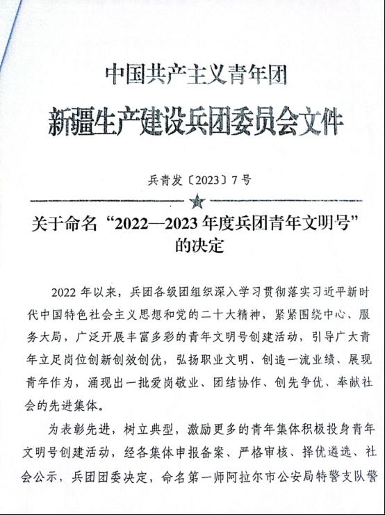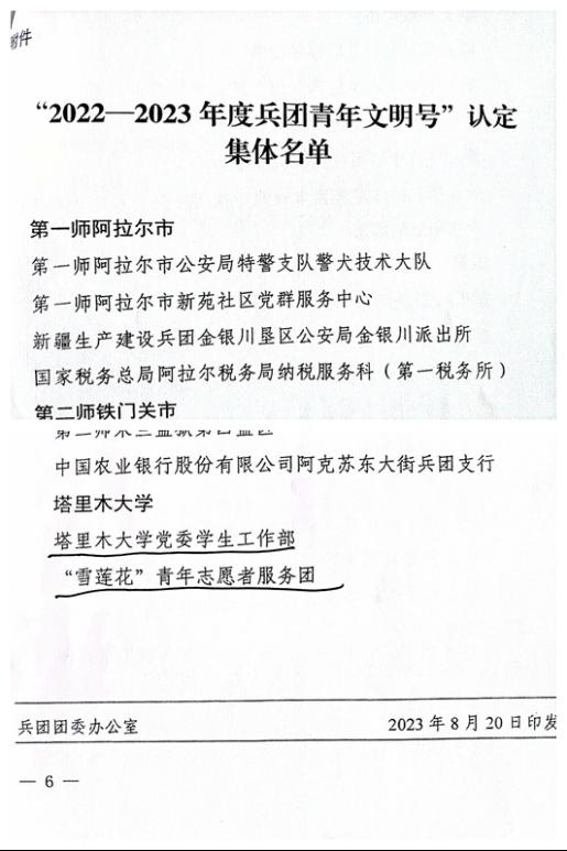 8月20日,兵团团委以文件形式下发《关于命名“2022-2023年度兵团青年文明号”的决定》,命名第一师阿拉尔市公安局特警支队警犬技术大队等60个青年集体为“2022-2023年度兵团青年文明号”。beat365中文登录入口党委学生工作部、“雪莲花”青年志愿者服务团获此称号。