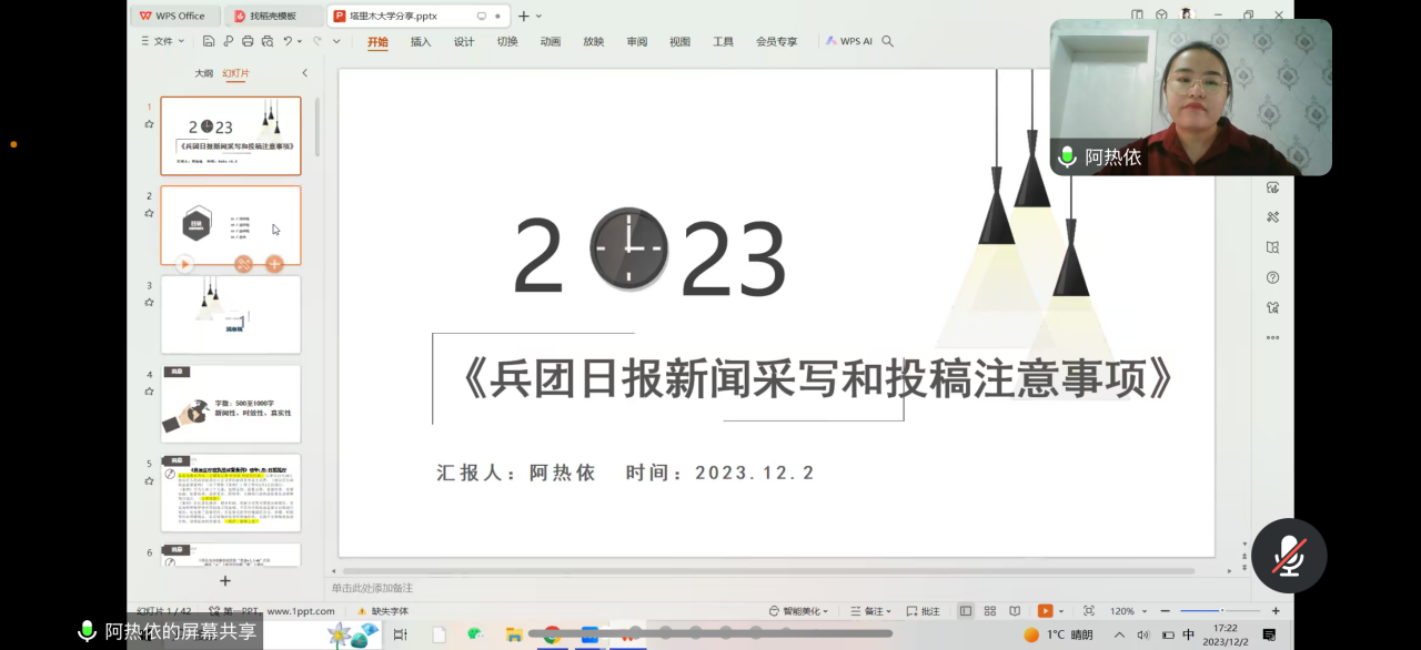 12月2日下午,兵团日报全媒体记者阿热依·热依哈巴提受邀为beat365中文登录入口2023年新闻工作骨干能力提升研修班学员开展线上专题讲座。讲座由党委宣传部新闻中心(融媒体中心)工作人员赵建博主持。