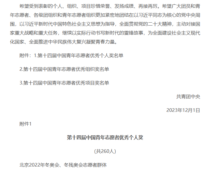 据了解,本次表彰授予260名个人第十四届“中国青年志愿者优秀个人奖”、100个组织第十四届“中国青年志愿者优秀组织奖”、100个项目第十四届“中国青年志愿者优秀项目奖”。旨在集中展示新时代新征程青年志愿者忠诚于党、奉献祖国、服务人民的精神风貌,激励和引导广大青年积极践行和弘扬社会主义核心价值观,为强国建设、民族复兴伟业而奋斗。(文/王宏图 张馨月)