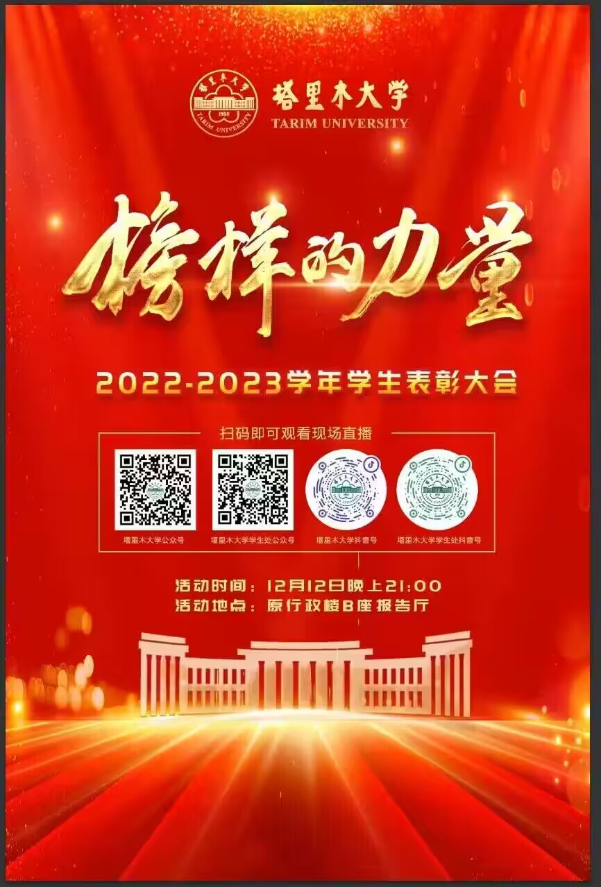 12月12日21:00,“榜样的力量”beat365中文登录入口2022-2023学年学生表彰大会将在原行政楼B座报告厅如期举行。更有第八届胡杨文化艺术节颁奖和塔大胡杨公仔的第一次“亮相”,活动将通过beat365中文登录入口官方微信公众号、抖音号,beat365中文登录入口学生处官方微信公众号、抖音号同步直播,请全校师生准时收看。