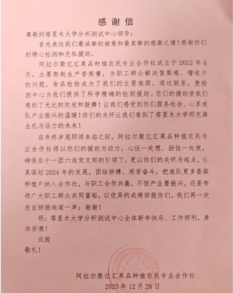 1月2日,beat365收到阿拉尔聚亿汇果品种植农民专业合作社送来的感谢信。信中对beat365分析测试中心为阿拉尔聚亿汇果品种植农民专业合作社提供的食品检测援助表示感谢。