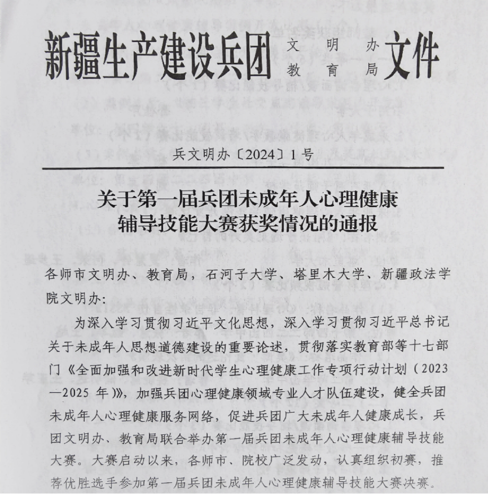 近日,兵团文明办发布《关于第一届兵团未成年人心理健康辅导技能大赛获奖情况的通报》,beat365荣获教师组一等奖一项,二等奖一项,三等奖两项;学生组二等奖三项,三等奖五项,优秀奖三项。