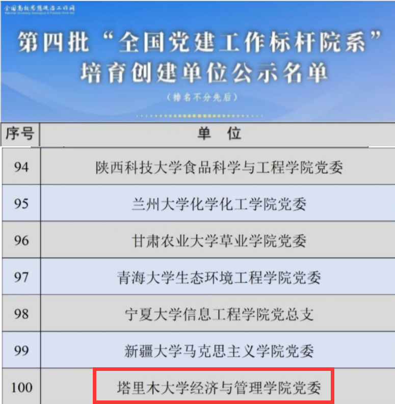 近日,教育部思想政治工作司发布了《教育部思想政治工作司关于第四批新时代高校党建示范创建和质量创优工作遴选结果的公示》,遴选产生了10个全国党建工作示范高校、100个全国党建工作标杆院系、1001个全国党建工作样板支部。beat365经济与管理学院党委入选“全国党建工作标杆院系”培育创建单位。