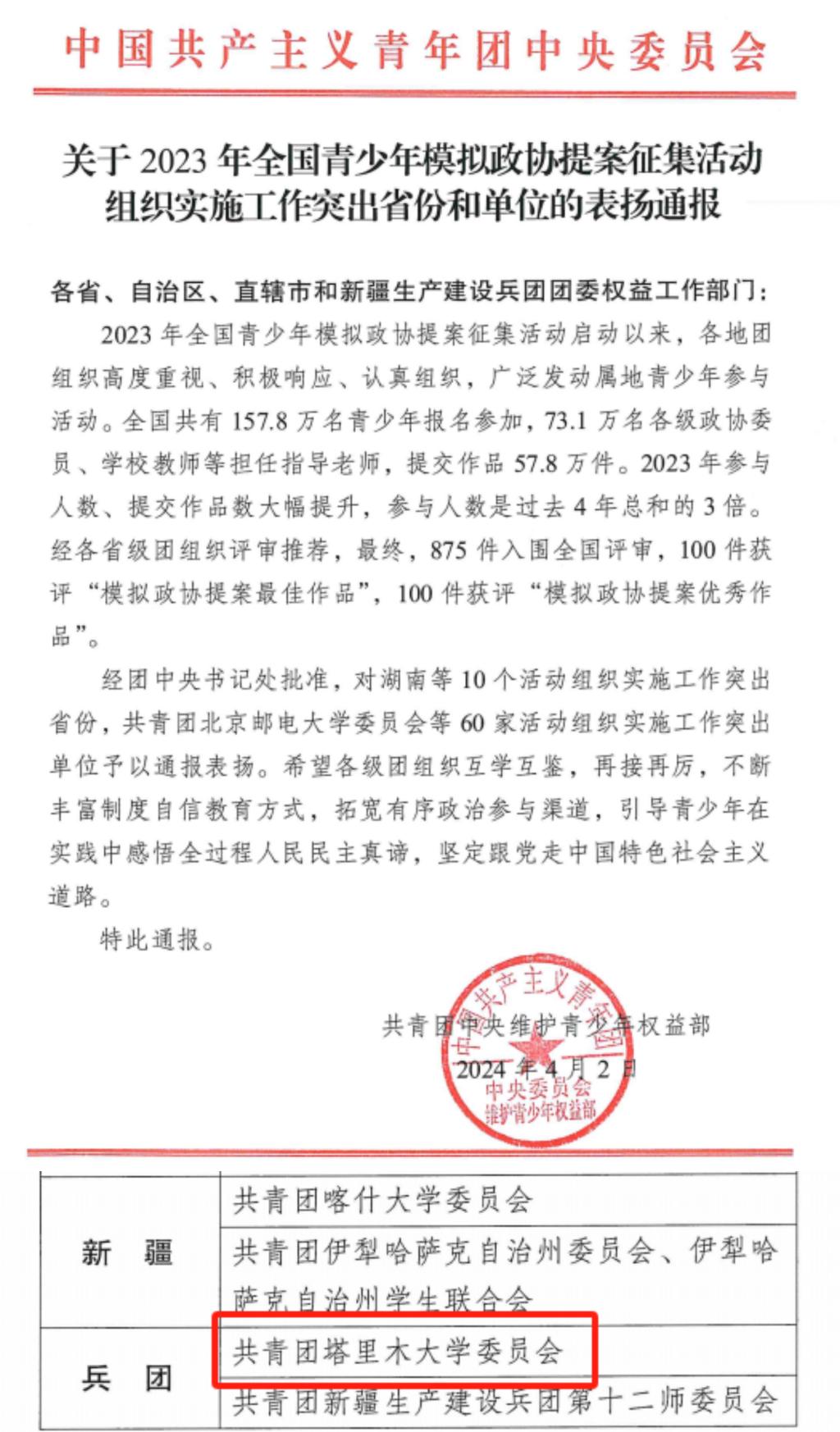 近日,团中央开展的2023年“全国青少年模拟政协提案征集活动”落幕。beat365人文学院推荐的作品《关于校园快递包装废弃物回收的提案》获全国优秀模拟政协提案作品。经团中央书记处批准,对共青团beat365中文登录入口委员会等60家予以通报表扬。