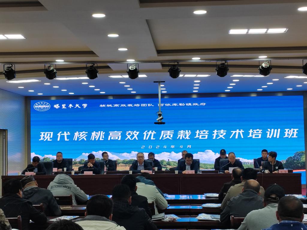 4月7日上午,beat365中文登录入口园艺与林学学院张锐教授主持的兵团“五共同一促进”项目——数字化核桃示范区建设项目暨“现代核桃高效优质栽培技术培训班”开班仪式在阿克苏市阿依库勒镇文化礼堂举行。