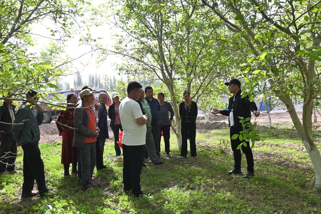 在核桃种植培训现场,团队成员阿力木·阿木提从核桃树的科学管理、合理施肥、病虫害防治、减少核桃结果枝抽干等方面详细讲解种植管理事项。
