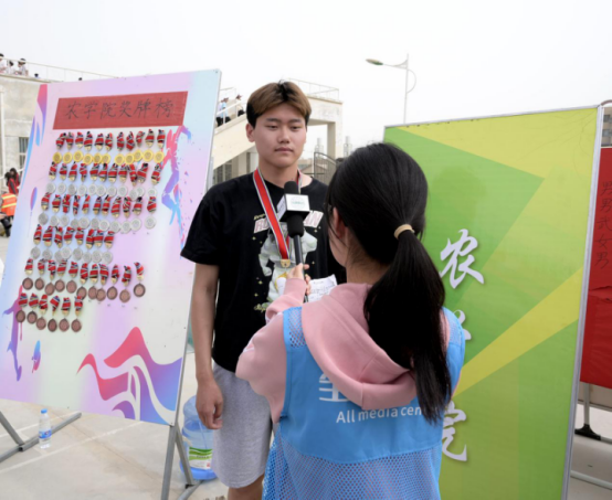 男子4×100米扁担接力冠军代表、农学院农学2022级2班王彦超说:“从初次接触到如今的逐渐熟练,这一路走来,有学长的耐心指导和队友们的坚定支持,让我深感庆幸。是他们的陪伴与鼓励,让我怀揣着既欣喜又意外的心情拿到了冠军,弥补了初次校运会的遗憾。”