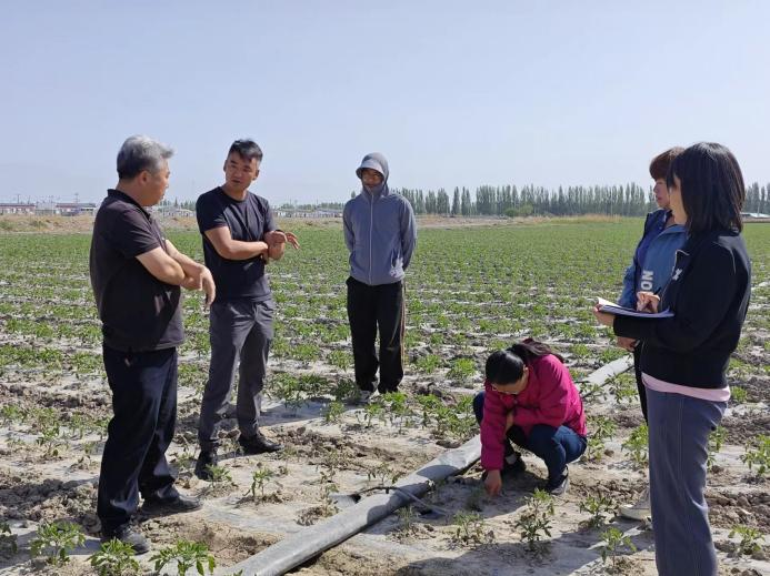 团队成员与二十二团二连、九连职工代表就连队发展现状、种植结构、作物病虫害防治、肥料施用等进行深入交流,深入番茄、辣椒等种植区,实地调研作物种植生长和产业发展情况并进行水资源利用指导。团队成员还对二十五团及博湖县本布图镇的作物种植田块进行土壤取样并化验。