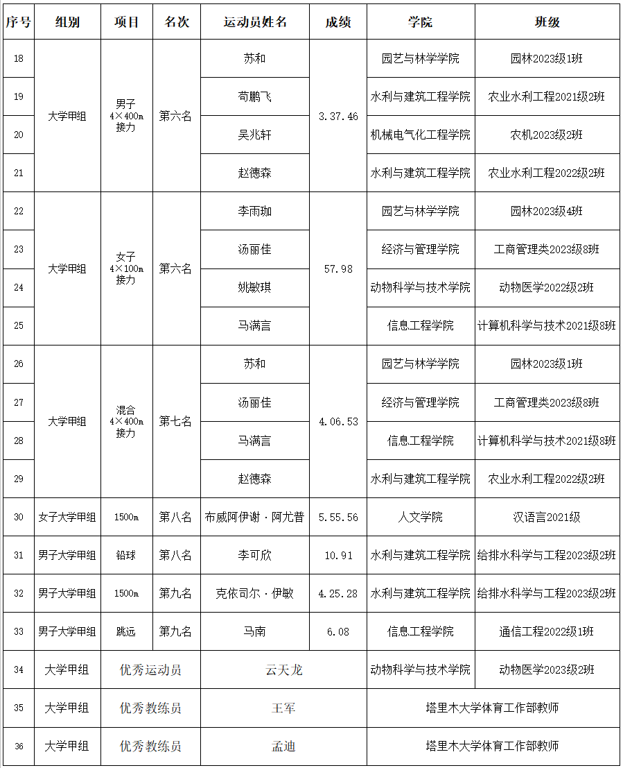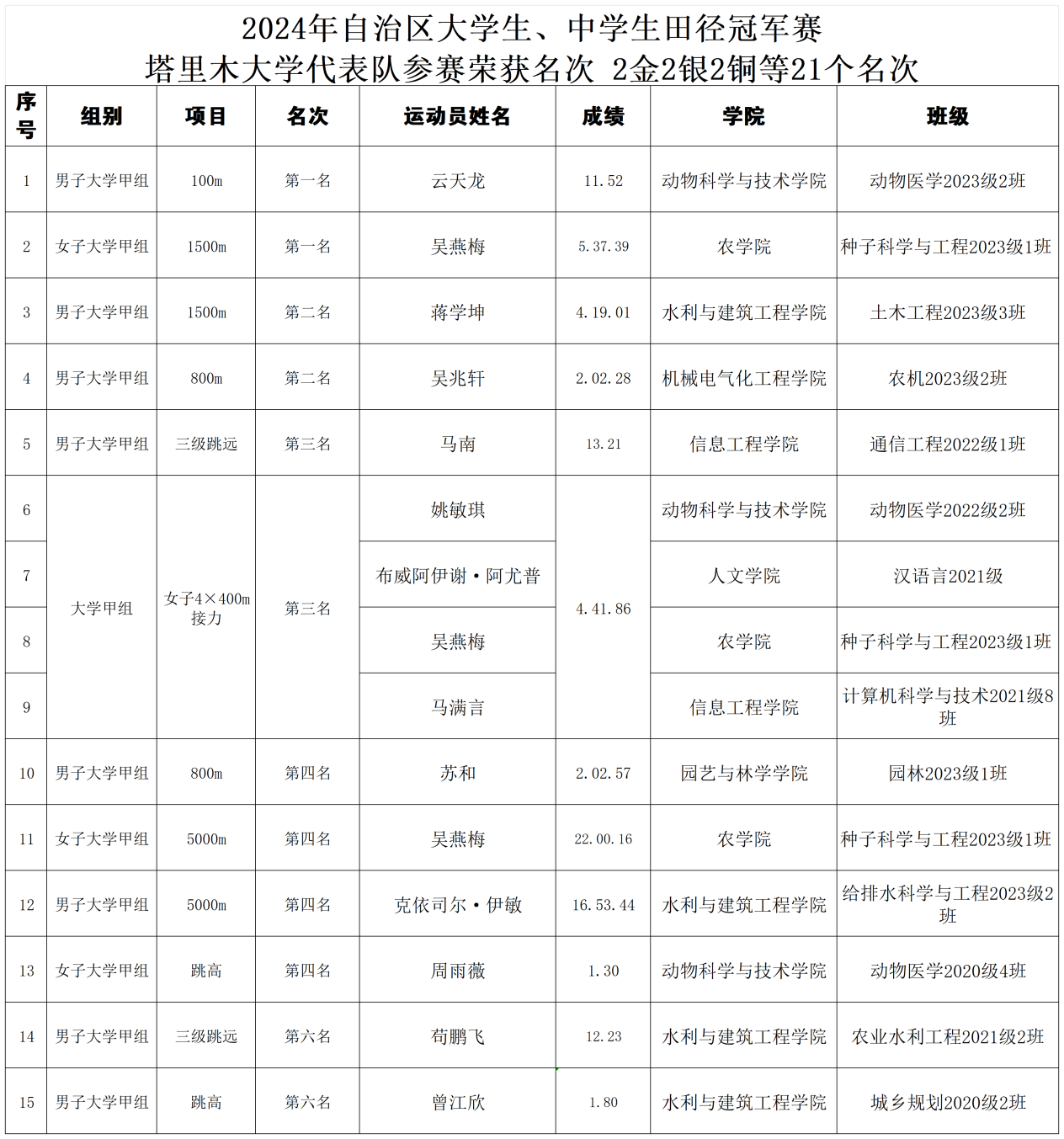 5月30日-6月1日,2024年自治区大学生、中学生田径冠军赛在新疆农业大学举行。beat365中文登录入口代表队摘得2金2银2铜等21个名次,在大学甲组28支代表队中获得“团体总分第五名”的好成绩。体育工作部王军、孟迪被评为“优秀教练员”,动物科学与技术学院云天龙被评为“优秀运动员”。