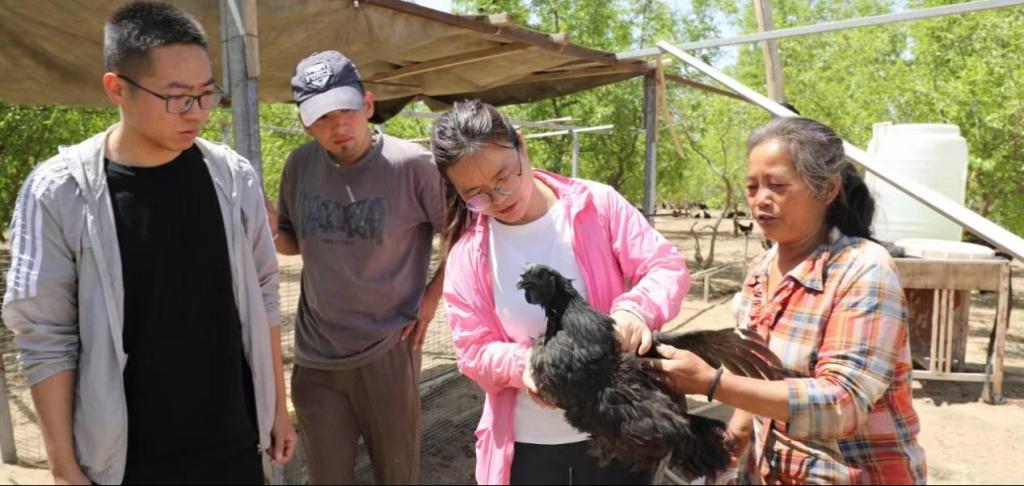 团队深入养鸡场详细了解肉鸡生长状况,与连队职工就孵化育苗、疫病防控、产蛋育肥等方面进行深入沟通。团队成员耐心解答连队职工提出的养殖难点问题,并手把手进行技术指导,帮助职工提高禽类养殖管理能力。期间,团队向合作社提供了300羽黑羽肉鸡鸡苗。