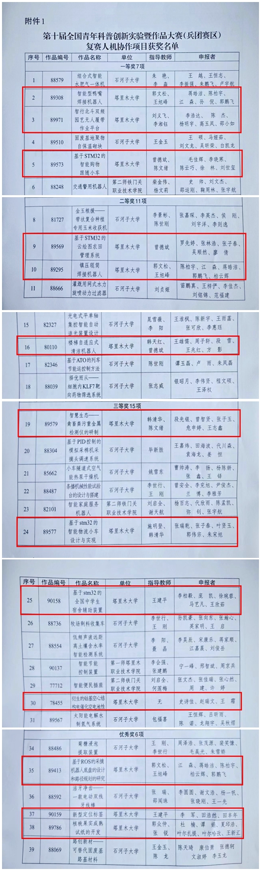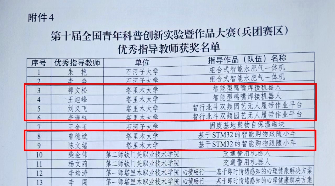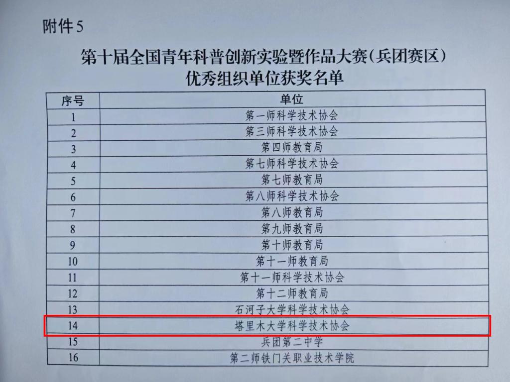 近日,兵团科学技术协会、兵团教育局公布了第十届全国青年科普创新实验暨作品大赛(兵团赛区)获奖名单。beat365获得一等奖3项、二等奖3项、三等奖4项、优秀奖3项,教师郭文松、王旭峰、刘义飞、李湘钰、曾德斌、陈文绪荣获“优秀指导教师”,beat365中文登录入口科学技术协会被评为“优秀组织单位”。