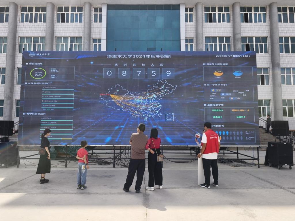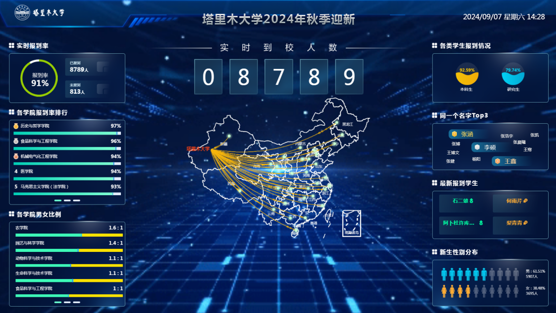 迎新现场,数据大屏实时显示新生报到情况,新生及家长纷纷驻足观看,了解报到数据。多维度、动态化、可视化呈现实时报到率、各学院报到率、各学院男女比例、新生性别分布、最新报到学生、同名同姓TOP3等相关新生数据,让学校领导、有关部门和学院师生及时准确了解新生报到信息,为高质量完成新生报到工作插上科技的翅膀。