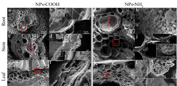 空心菜根、茎和叶中不同电性的NPs的扫描电子显微镜图像