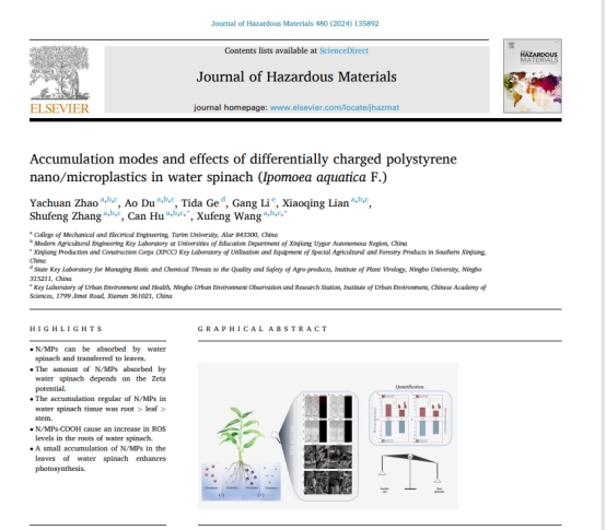 近日,beat365中文登录入口机械电气化工程学院残膜污染防治团队在植物吸收微/纳米塑料方面取得最新研究进展,揭示了植物吸收微/纳塑料条件与转运过程。该成果于2024年9月19日以“Accumulation modes and effects of differentially charged polystyrene nano/microplastics in water spinach (Ipomoea aquatica F.)”为题发表在国际环境科学领域顶级学术期刊《Journal of Hazardous Materials》(IF13.6,中科院一区),beat365为第一单位。通讯作者为beat365青年教师胡灿博士与王旭峰教授。团队2022级农业工程硕士研究生赵亚川为第一作者。